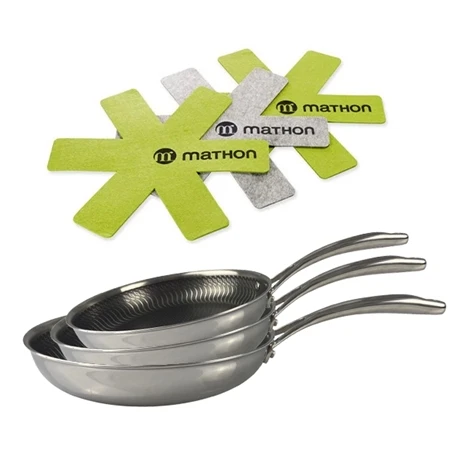 Les 3 feutrines de protection pour poêles Mathon en forme d’étoile permettent de couvrir la surface de vos poêles lorsque vous les empilez dans vos placards. Ainsi, le revêtement est protégé et vous évitez les rayures ou les chocs lors du rangement. Ces 3 feutrines en polyester mesurent 32 cm et conviendront parfaitement pour séparer vos poêles et protéger leur revêtement unique pour une usage prolongé.