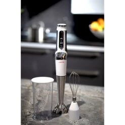 Peu encombrant, le mixeur plongeant est l’appareil de petit électroménager idéal en cuisine. Branché sur secteur, il mixe vos préparations grâce à sa lame située au bout d’un long pied et se range sans difficultés.